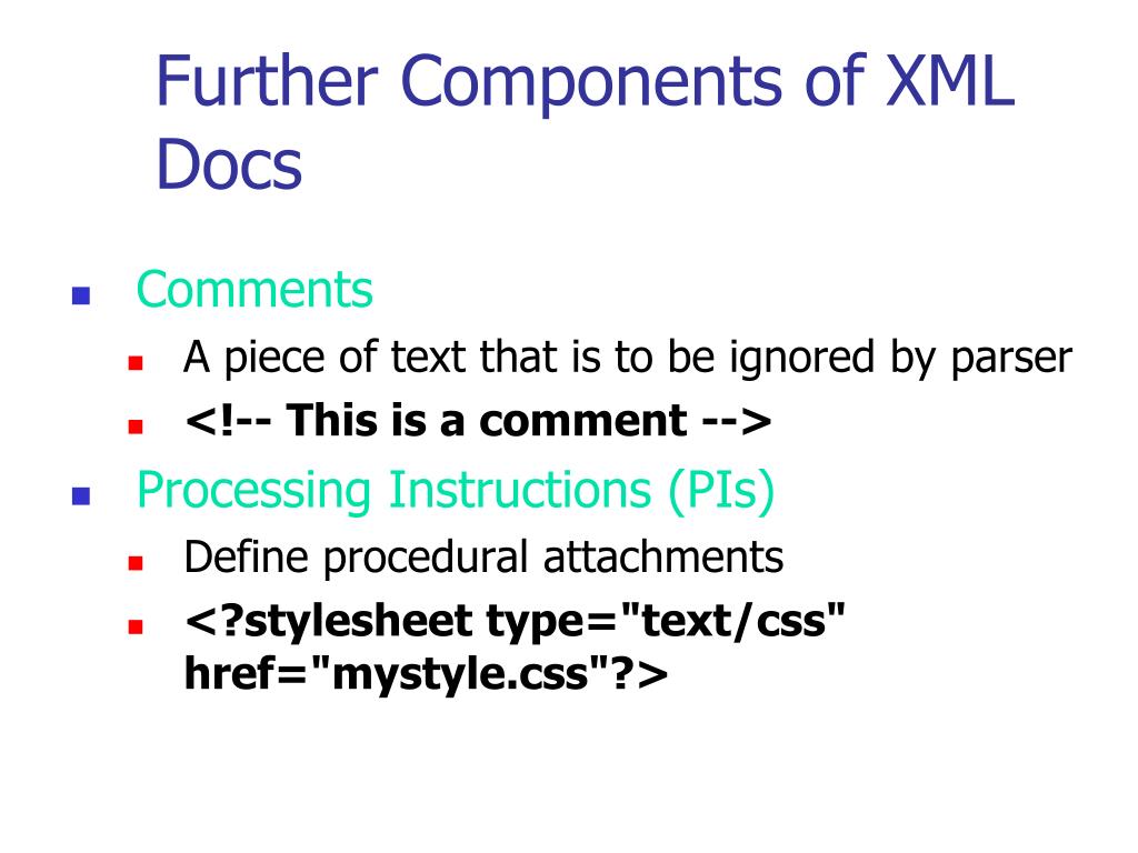 Further Components of XML Docs • Comments • A piece of text that is to be ignored by parser • <!-- This is a comment --> • Processing Instructions (PIs) • Define procedural attachments • <?stylesheet type="text/css" href="mystyle.css"?>