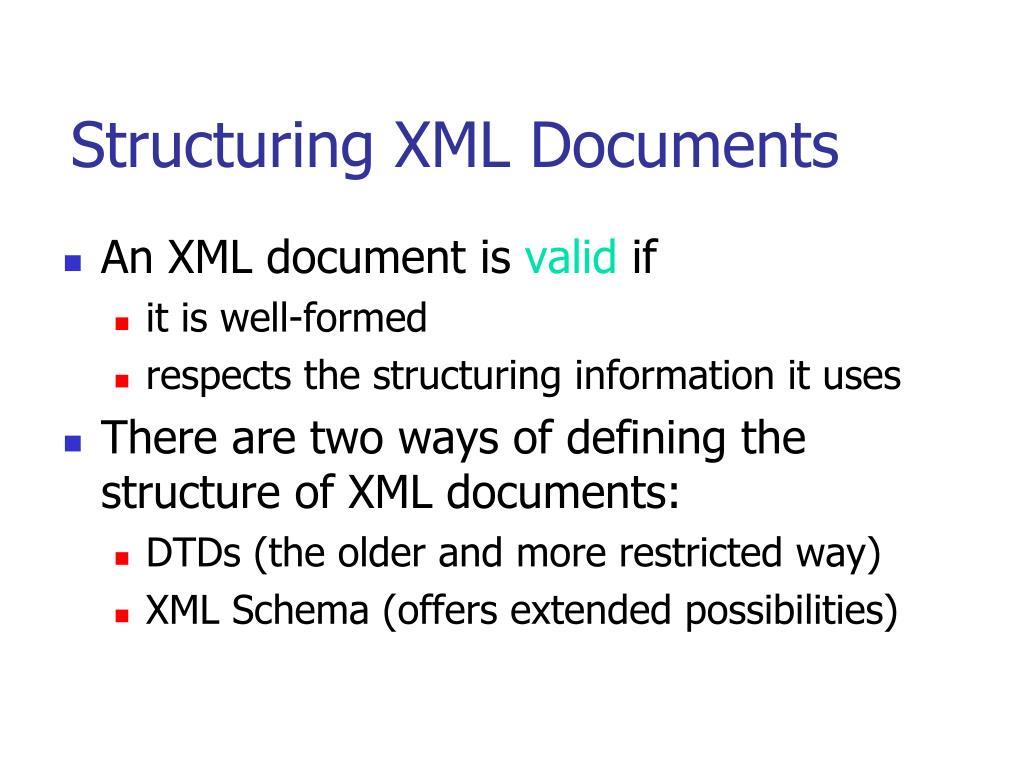 Structuring XML Documents • An XML document is valid if • it is well-formed • respects the structuring information it uses • There are two ways of defining the structure of XML documents: • DTDs (the older and more restricted way) • XML Schema (offers extended possibilities)
