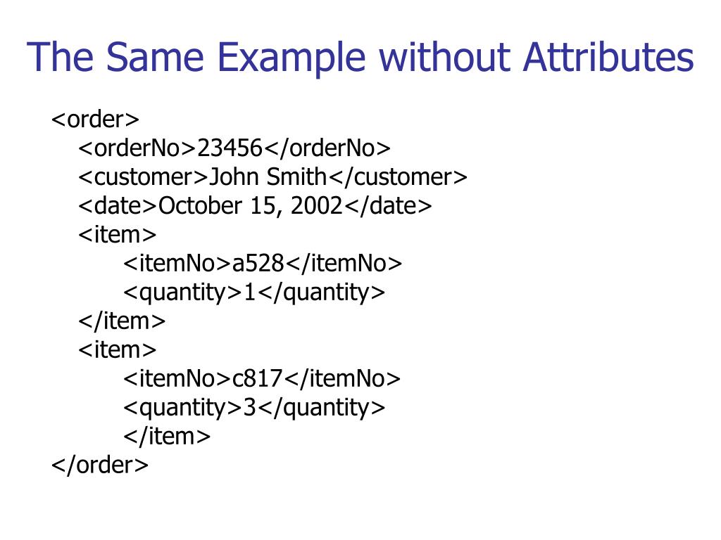 The Same Example without Attributes <order> <orderNo>23456</orderNo> <customer>John Smith</customer> <date>October 15, 2002</date> <item> <itemNo>a528</itemNo> <quantity>1</quantity> </item> <item> <itemNo>c817</itemNo> <quantity>3</quantity> </item> </order>