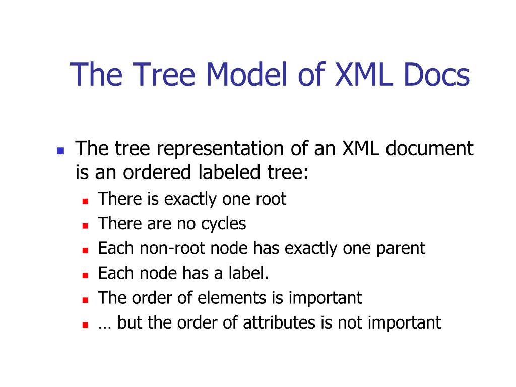 The Tree Model of XML Docs • The tree representation of an XML document is an ordered labeled tree: • There is exactly one root • There are no cycles • Each non-root node has exactly one parent • Each node has a label. • The order of elements is important • … but the order of attributes is not important