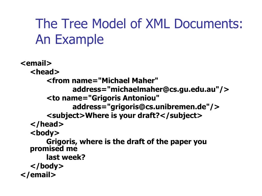 The Tree Model of XML Documents: An Example <email> <head> <from name="Michael Maher" address="michaelmaher@cs.gu.edu.au"/> <to name="Grigoris Antoniou" address="grigoris@cs.unibremen.de"/> <subject>Where is your draft?</subject> </head> <body> Grigoris, where is the draft of the paper you promised me last week? </body> </email>