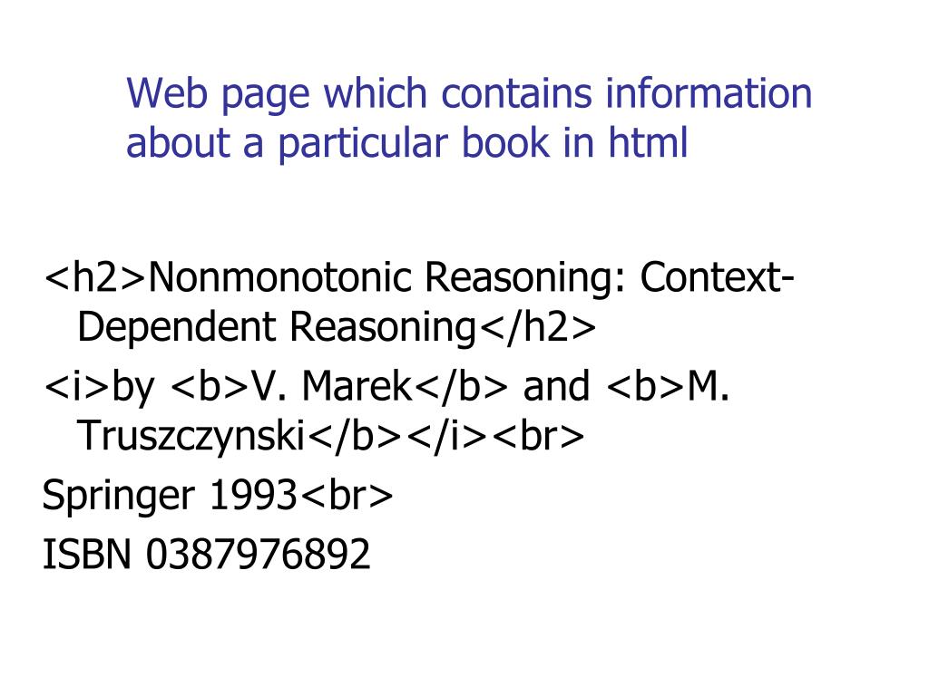 Web page which contains information about a particular book in html <h2>Nonmonotonic Reasoning: Context-Dependent Reasoning</h2> <i>by <b>V. Marek</b> and <b>M. Truszczynski</b></i><br> Springer 1993<br> ISBN 0387976892