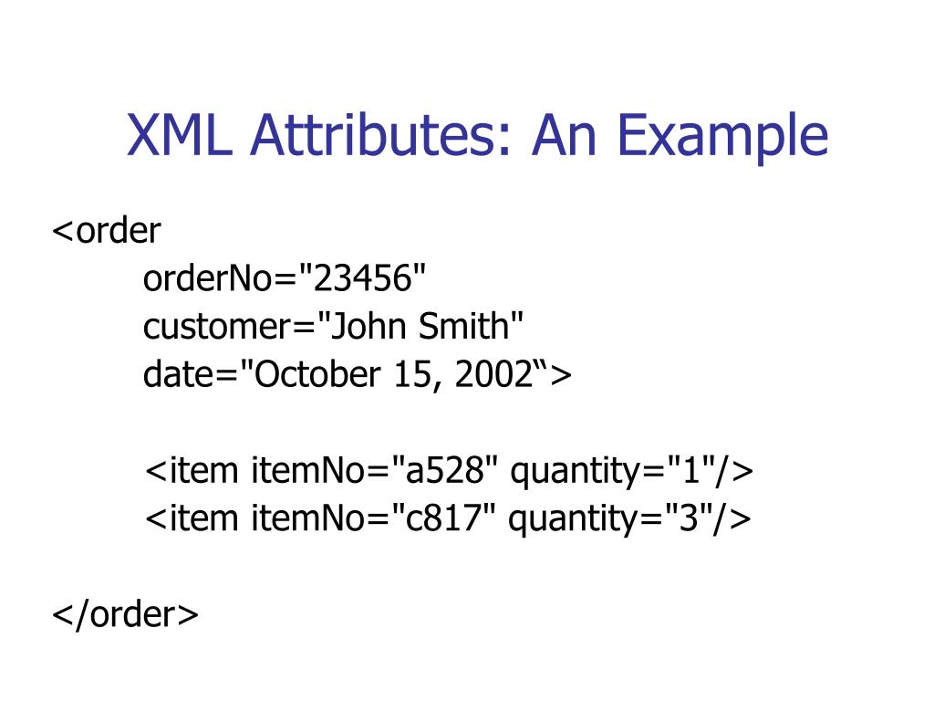 XML Attributes: An Example <order orderNo="23456" customer="John Smith" date="October 15, 2002“> <item itemNo="a528" quantity="1"/> <item itemNo="c817" quantity="3"/> </order>