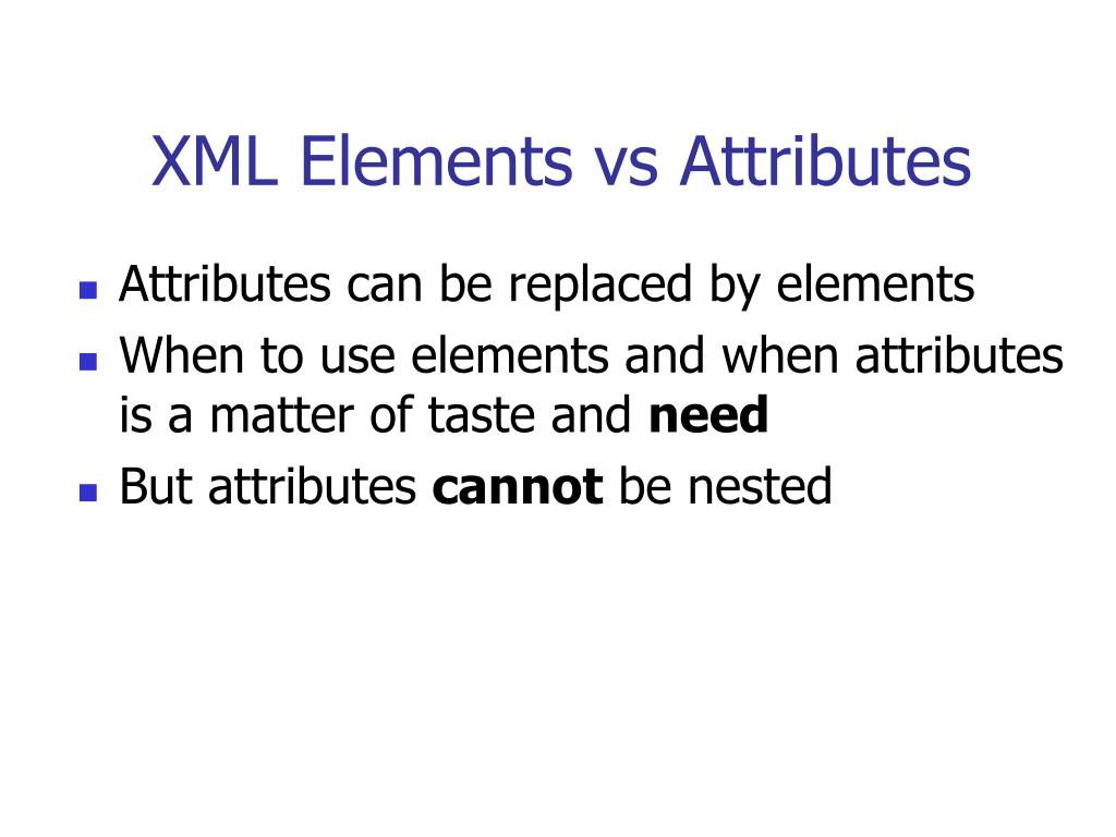 XML Elements vs Attributes • Attributes can be replaced by elements • When to use elements and when attributes is a matter of taste and need • But attributes cannot be nested