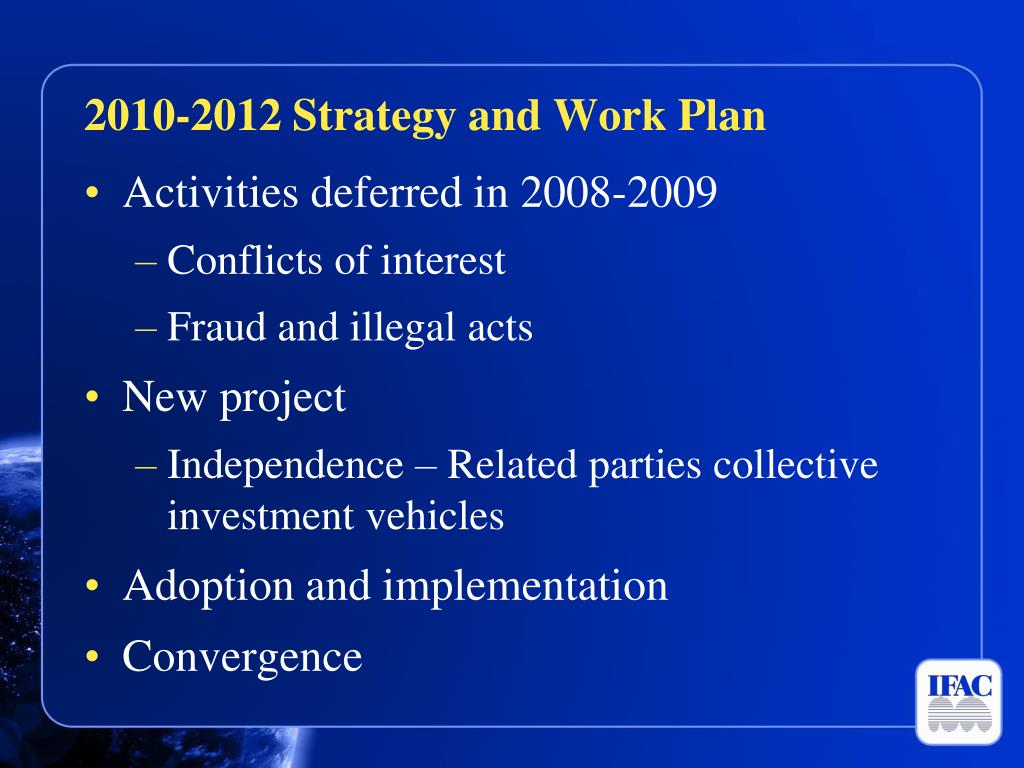2010-2012 Strategy and Work Plan • Activities deferred in 2008-2009 • Conflicts of interest • Fraud and illegal acts • New project • Independence – Related parties collective investment vehicles • Adoption and implementation • Convergence