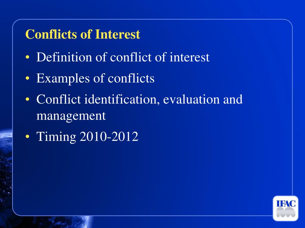Conflicts of Interest Definition of conflict of interest Examples of conflicts Conflict identification, evaluation and management Timing 2010-2012