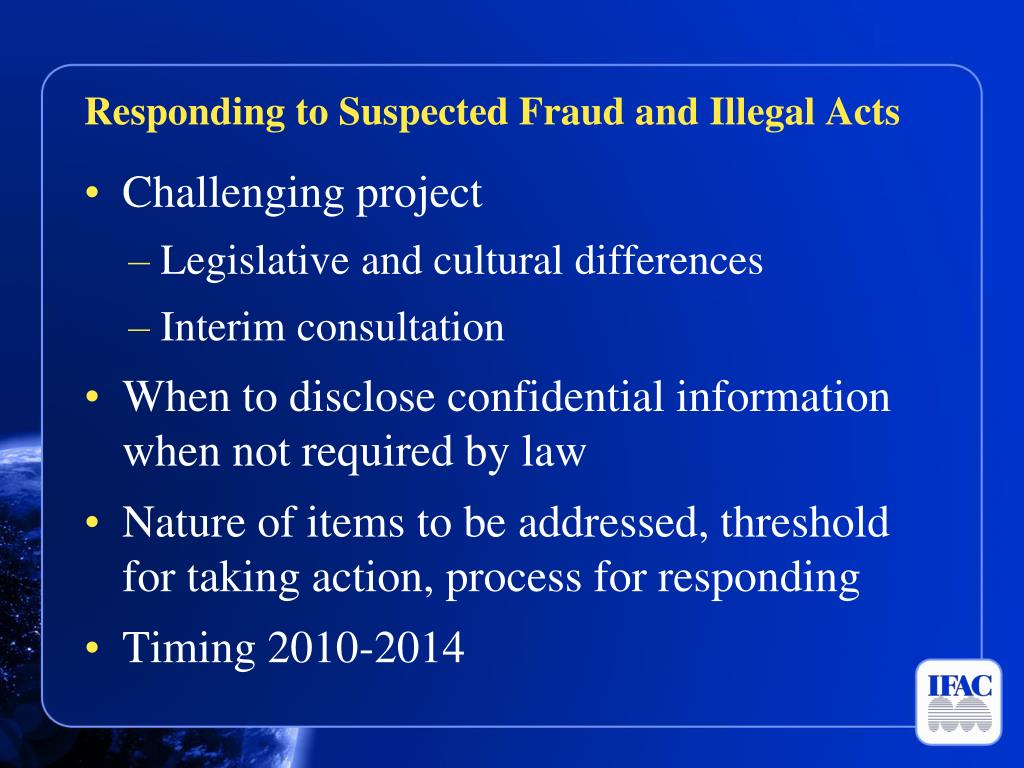 Responding to Suspected Fraud and Illegal Acts • Challenging project • Legislative and cultural differences • Interim consultation • When to disclose confidential information when not required by law • Nature of items to be addressed, threshold for taking action, process for responding • Timing 2010-2014