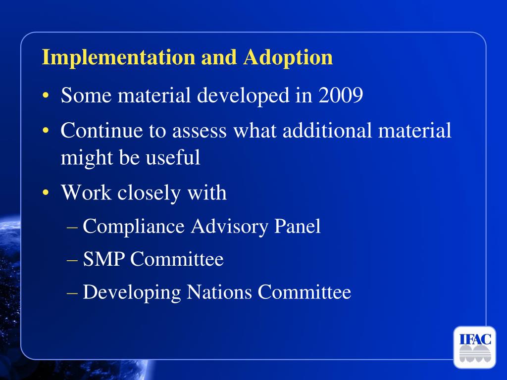 Implementation and Adoption • Some material developed in 2009 • Continue to assess what additional material might be useful • Work closely with • Compliance Advisory Panel • SMP Committee • Developing Nations Committee