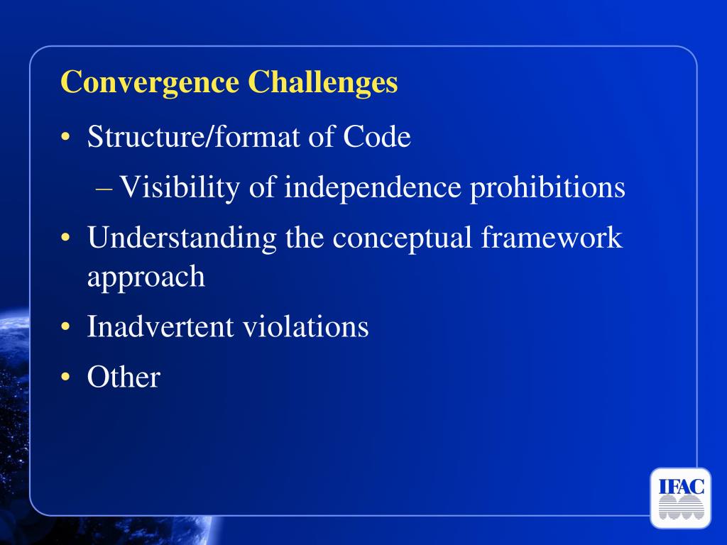 Convergence Challenges • Structure/format of Code • Visibility of independence prohibitions • Understanding the conceptual framework approach • Inadvertent violations • Other