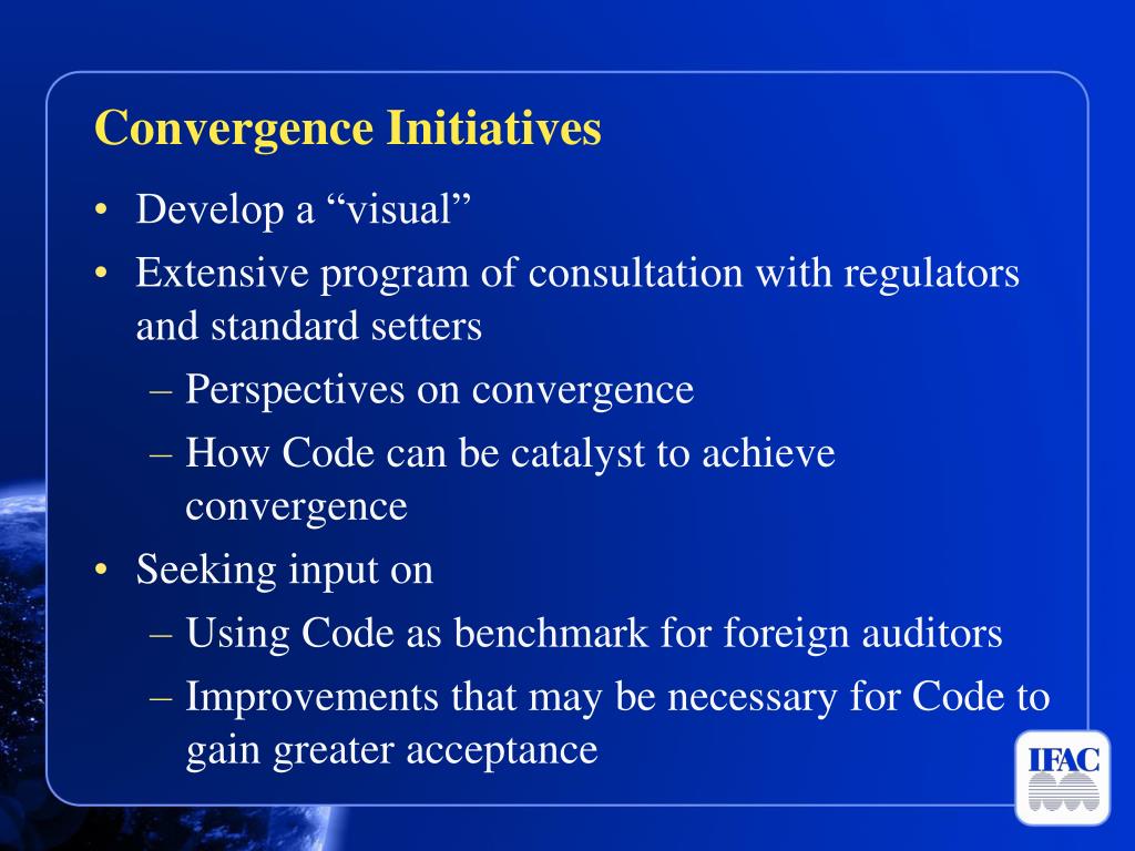 Convergence Initiatives • Develop a “visual” • Extensive program of consultation with regulators and standard setters • Perspectives on convergence • How Code can be catalyst to achieve convergence • Seeking input on • Using Code as benchmark for foreign auditors • Improvements that may be necessary for Code to gain greater acceptance