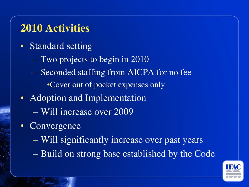 2010 Activities • Standard setting • Two projects to begin in 2010 • Seconded staffing from AICPA for no fee • Cover out of pocket expenses only • Adoption and Implementation • Will increase over 2009 • Convergence • Will significantly increase over past years • Build on strong base established by the Code