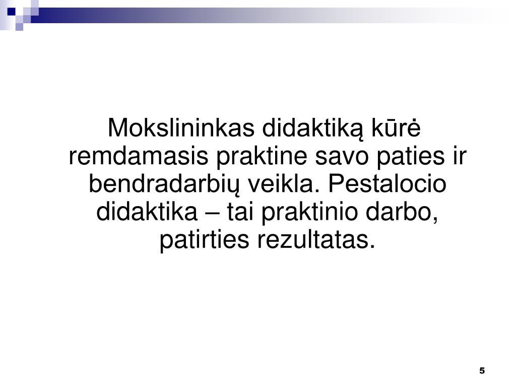 Mokslininkas didaktiką kūrė remdamasis praktine savo paties ir bendradarbių veikla. Pestalocio didaktika – tai praktinio darbo, patirties rezultatas.