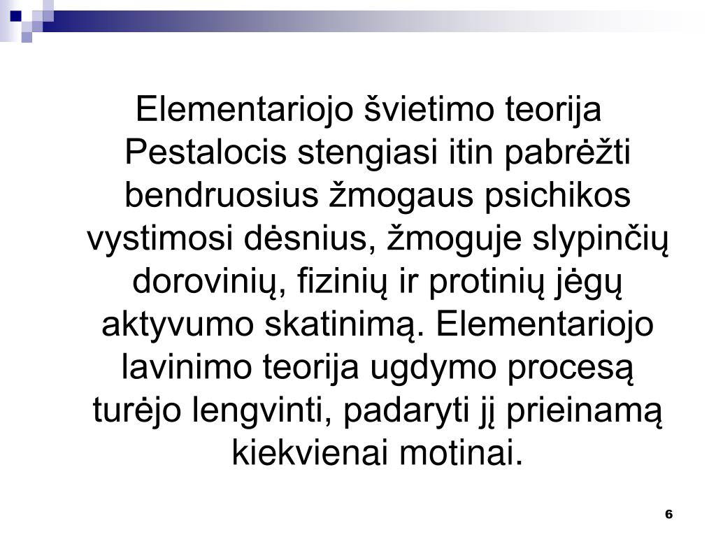 Elementariojo švietimo teorija Pestalocis stengiasi itin pabrėžti bendruosius žmogaus psichikos vystimosi dėsnius, žmoguje slypinčių dorovinių, fizinių ir protinių jėgų aktyvumo skatinimą. Elementariojo lavinimo teorija ugdymo procesą turėjo lengvinti, padaryti jį prieinamą kiekvienai motinai.