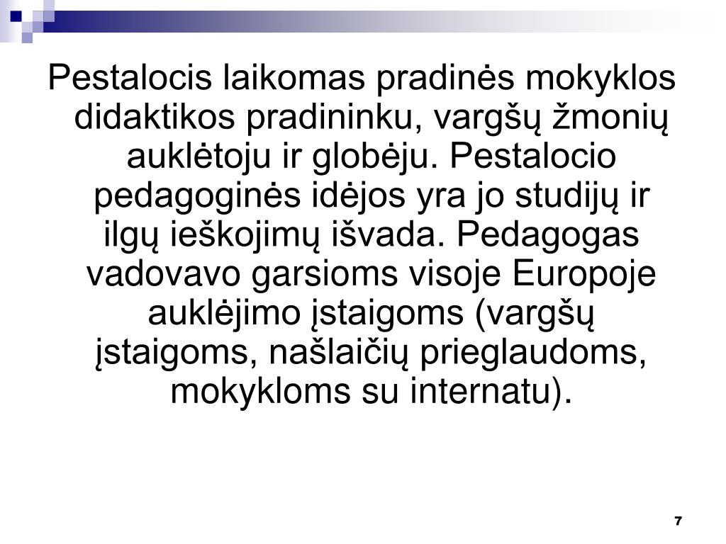 Pestalocis laikomas pradinės mokyklos didaktikos pradininku, vargšų žmonių auklėtoju ir globėju. Pestalocio pedagoginės idėjos yra jo studijų ir ilgų ieškojimų išvada. Pedagogas vadovavo garsioms visoje Europoje auklėjimo įstaigoms (vargšų įstaigoms, našlaičių prieglaudoms, mokykloms su internatu).