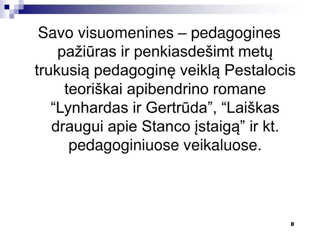 Savo visuomenines – pedagogines pažiūras ir penkiasdešimt metų trukusią pedagoginę veiklą Pestalocis teoriškai apibendrino romane “Lynhardas ir Gertrūda”, “Laiškas draugui apie Stanco įstaigą” ir kt. pedagoginiuose veikaluose.