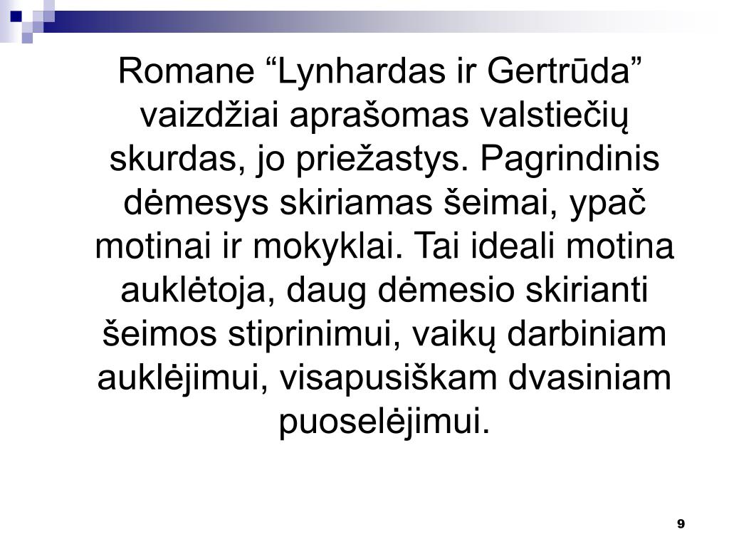 Romane “Lynhardas ir Gertrūda” vaizdžiai aprašomas valstiečių skurdas, jo priežastys. Pagrindinis dėmesys skiriamas šeimai, ypač motinai ir mokyklai. Tai ideali motina auklėtoja, daug dėmesio skirianti šeimos stiprinimui, vaikų darbiniam auklėjimui, visapusiškam dvasiniam puoselėjimui.