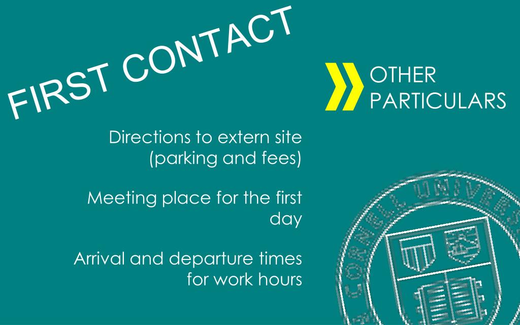 First Contact OTHER PARTICULARS Directions to extern site (parking and fees) Meeting place for the first day Arrival and departure times for work hours
