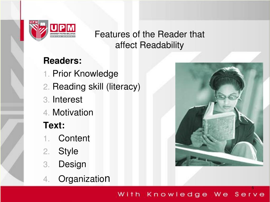Features of the Reader thataffect Readability Readers: Prior Knowledge Reading skill (literacy) Interest Motivation Text: Content Style Design Organization
