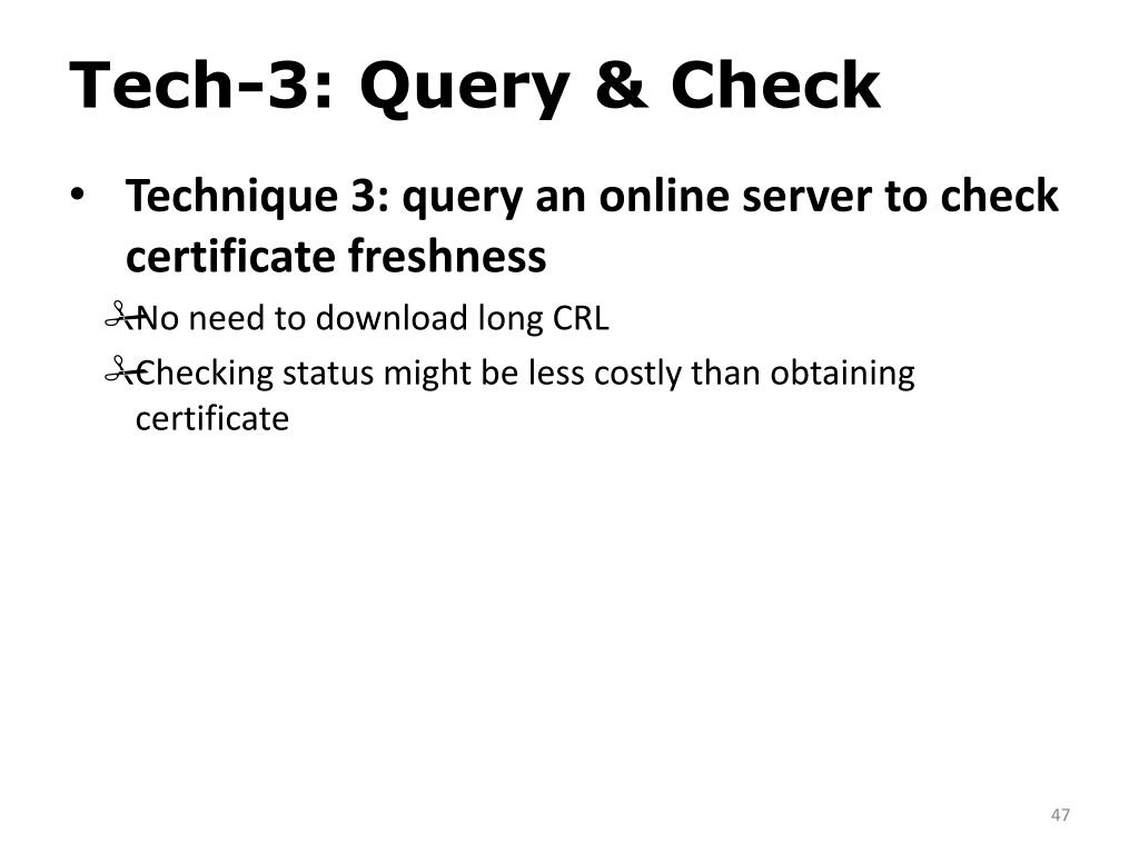 Tech-3: Query & Check • Technique 3: query an online server to check certificate freshness • No need to download long CRL • Checking status might be less costly than obtaining certificate