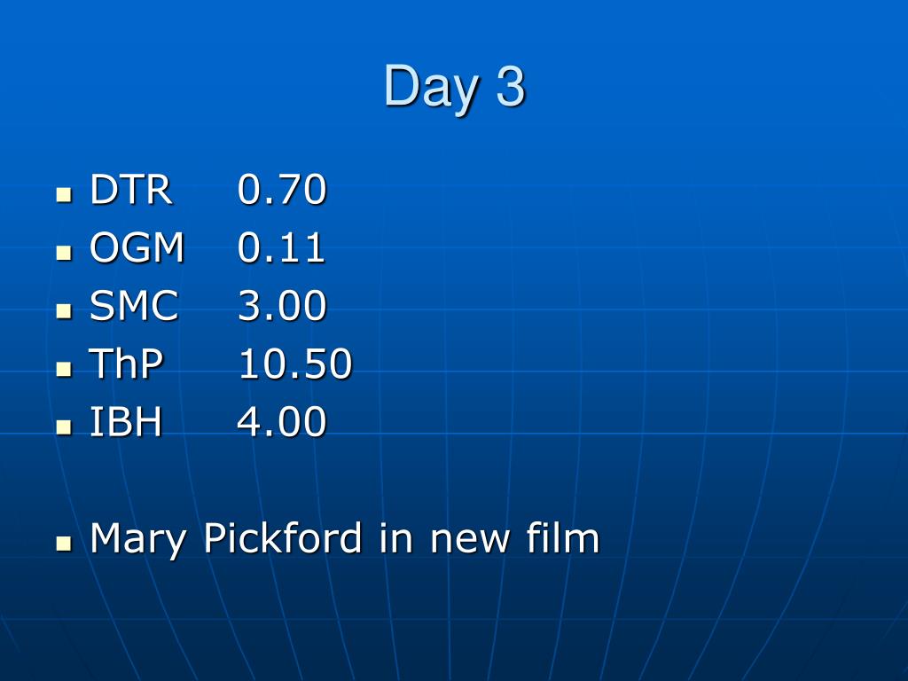 Day 3 • DTR 0.70 • OGM 0.11 • SMC 3.00 • ThP 10.50 • IBH 4.00 • Mary Pickford in new film