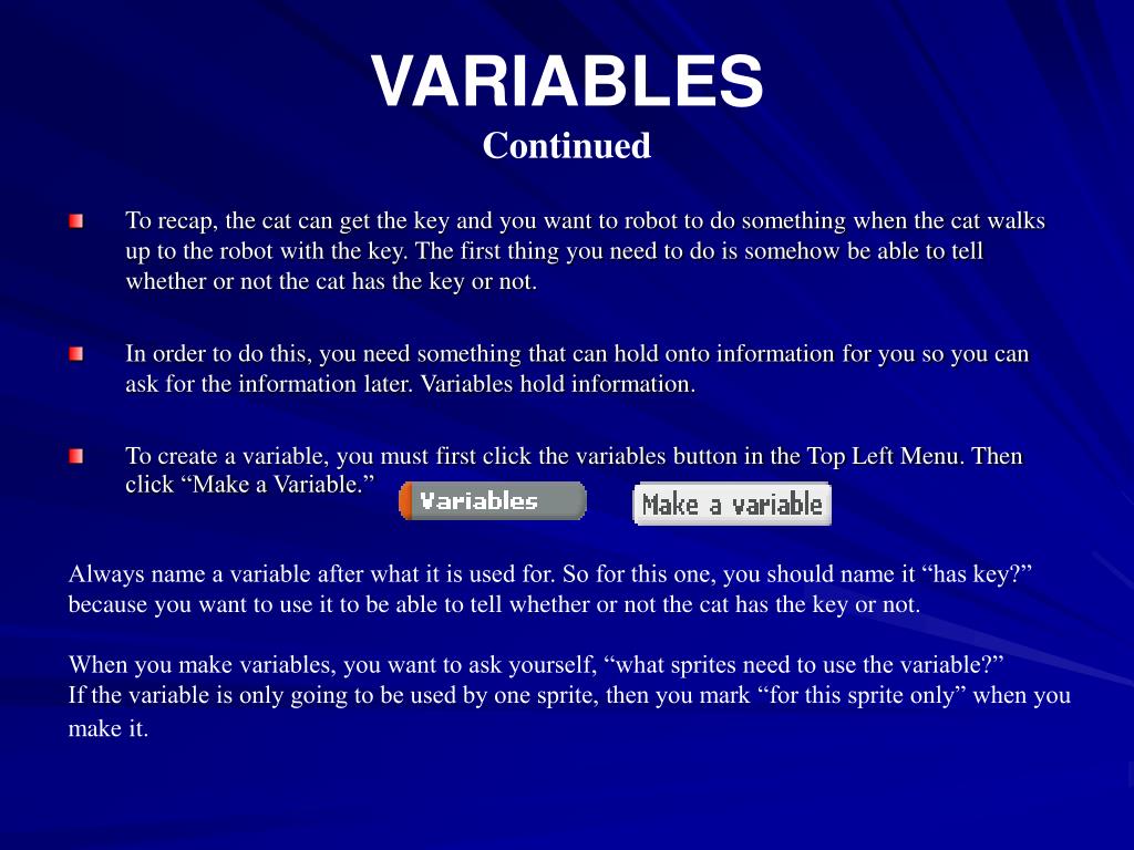 VARIABLESContinued • To recap, the cat can get the key and you want to robot to do something when the cat walks up to the robot with the key. The first thing you need to do is somehow be able to tell whether or not the cat has the key or not. • In order to do this, you need something that can hold onto information for you so you can ask for the information later. Variables hold information. • To create a variable, you must first click the variables button in the Top Left Menu. Then click “Make a Variable.” Always name a variable after what it is used for. So for this one, you should name it “has key?” because you want to use it to be able to tell whether or not the cat has the key or not. When you make variables, you want to ask yourself, “what sprites need to use the variable?” If the variable is only going to be used by one sprite, then you mark “for this sprite only” when you make it.