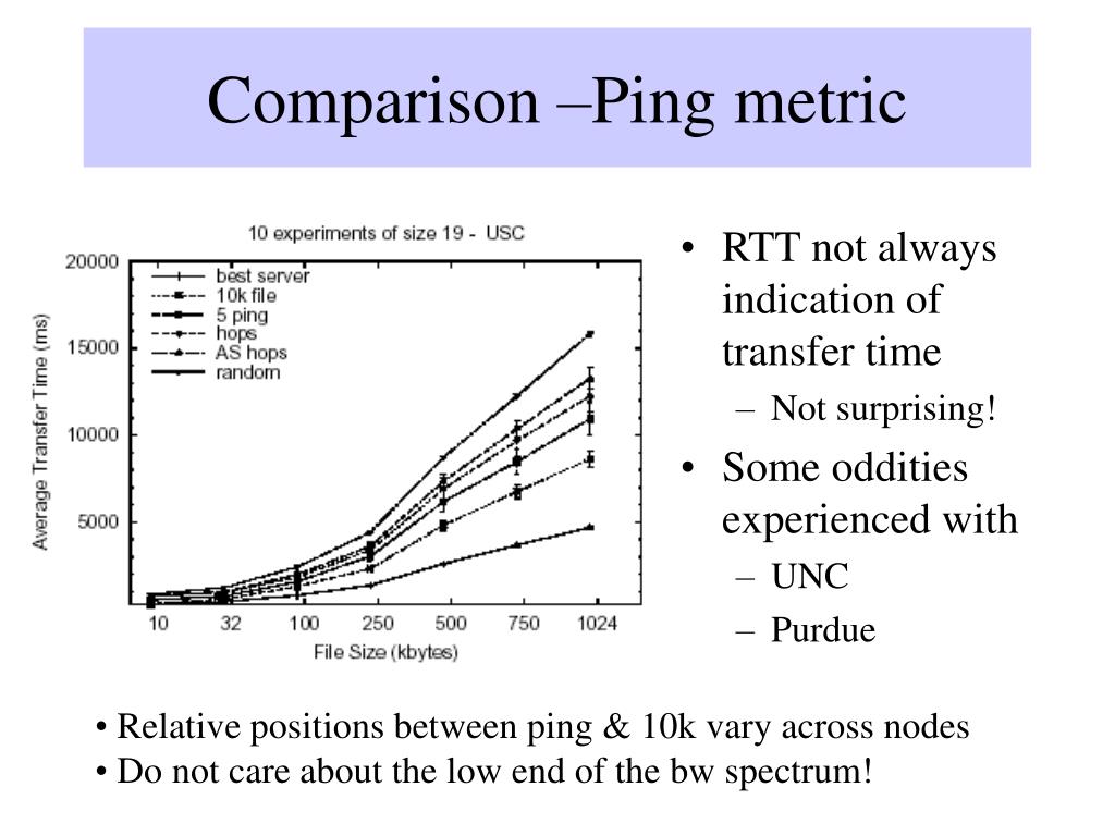 Comparison –Ping metric • RTT not always indication of transfer time • Not surprising! • Some oddities experienced with • UNC • Purdue • Relative positions between ping & 10k vary across nodes • Do not care about the low end of the bw spectrum!