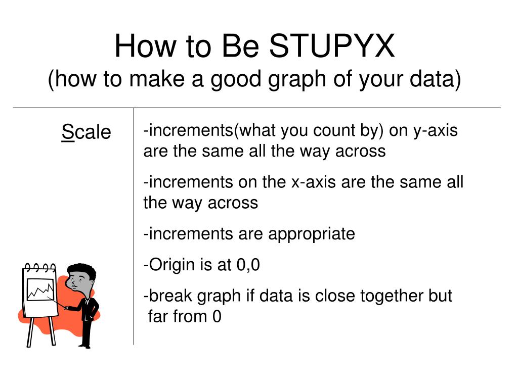 Scale • -increments(what you count by) on y-axis are the same all the way across • -increments on the x-axis are the same all the way across • -increments are appropriate • Origin is at 0,0 • break graph if data is close together but far from 0 How to Be STUPYX (how to make a good graph of your data)