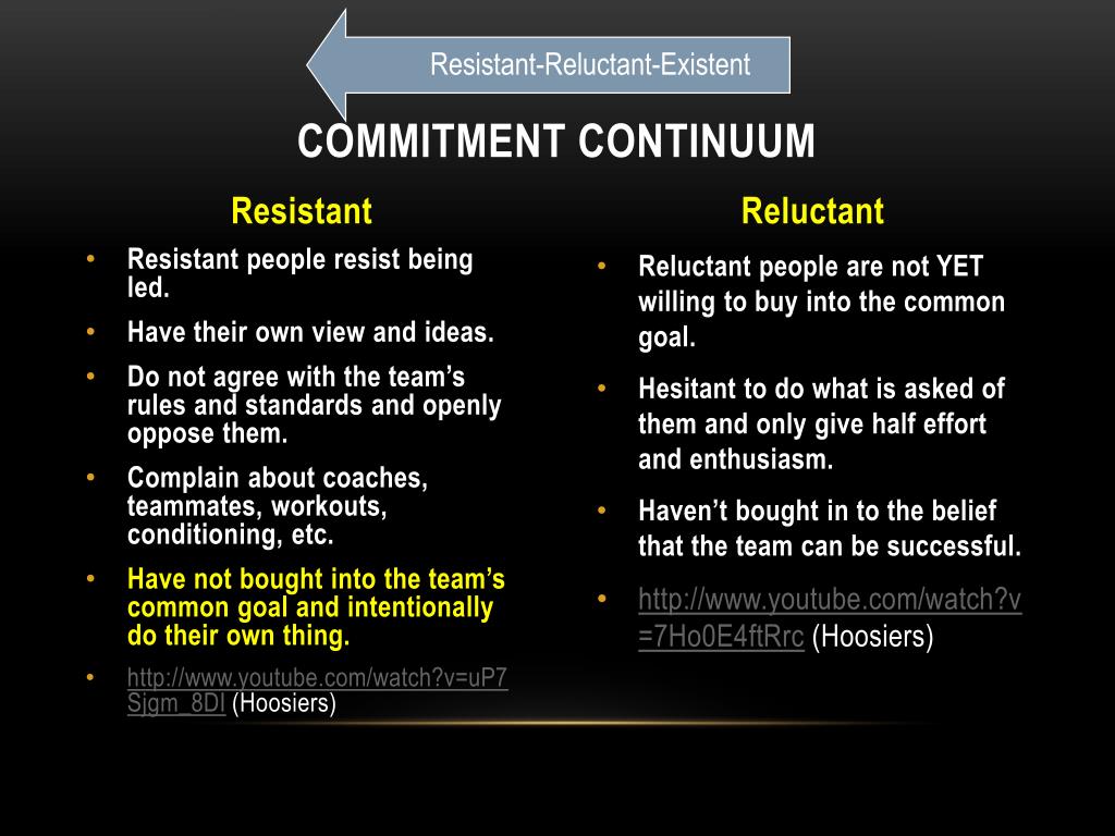 Commitment Continuum • Resistant-Reluctant-Existent Resistant Reluctant • Reluctant people are not YET willing to buy into the common goal. • Hesitant to do what is asked of them and only give half effort and enthusiasm. • Haven’t bought in to the belief that the team can be successful. • http://www.youtube.com/watch?v=7Ho0E4ftRrc (Hoosiers) • Resistant people resist being led. • Have their own view and ideas. • Do not agree with the team’s rules and standards and openly oppose them. • Complain about coaches, teammates, workouts, conditioning, etc. • Have not bought into the team’s common goal and intentionally do their own thing. • http://www.youtube.com/watch?v=uP7Sjgm_8DI (Hoosiers)