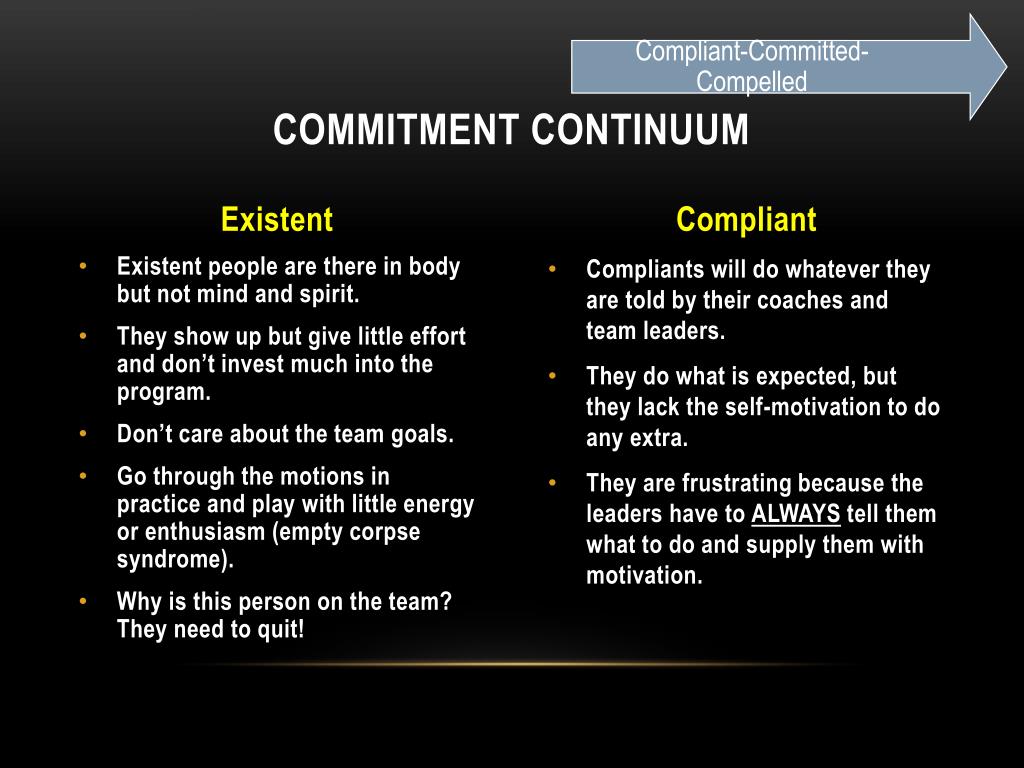 Commitment Continuum • Compliant-Committed-Compelled Existent Compliant • Compliants will do whatever they are told by their coaches and team leaders. • They do what is expected, but they lack the self-motivation to do any extra. • They are frustrating because the leaders have to ALWAYS tell them what to do and supply them with motivation. • Existent people are there in body but not mind and spirit. • They show up but give little effort and don’t invest much into the program. • Don’t care about the team goals. • Go through the motions in practice and play with little energy or enthusiasm (empty corpse syndrome). • Why is this person on the team? They need to quit!