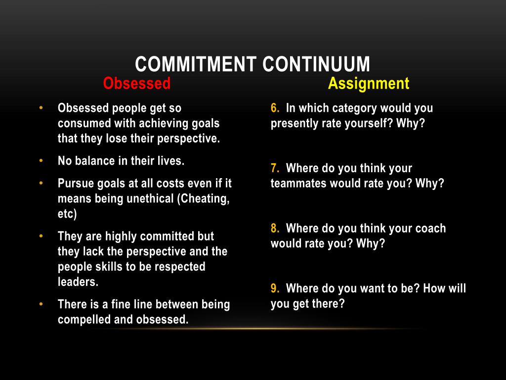 Commitment Continuum Obsessed Assignment 6. In which category would you presently rate yourself? Why? 7. Where do you think your teammates would rate you? Why? 8. Where do you think your coach would rate you? Why? 9. Where do you want to be? How will you get there? • Obsessed people get so consumed with achieving goals that they lose their perspective. • No balance in their lives. • Pursue goals at all costs even if it means being unethical (Cheating, etc) • They are highly committed but they lack the perspective and the people skills to be respected leaders. • There is a fine line between being compelled and obsessed.
