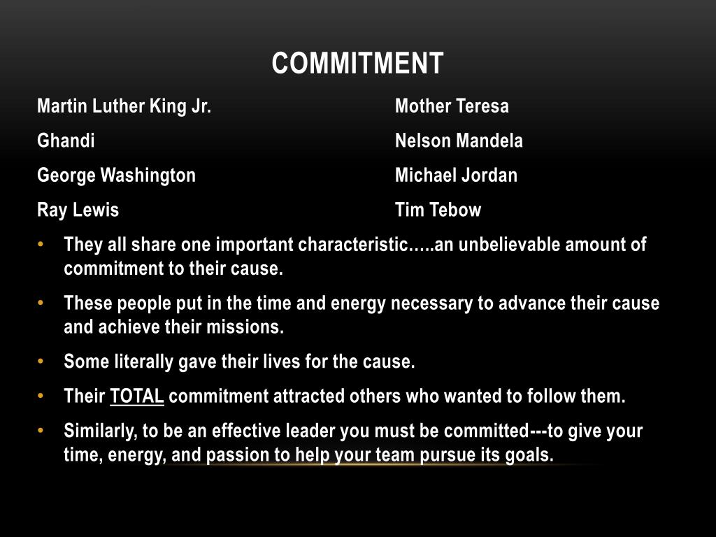 commitment Martin Luther King Jr. Mother Teresa Ghandi Nelson Mandela George Washington Michael Jordan Ray Lewis Tim Tebow • They all share one important characteristic…..an unbelievable amount of commitment to their cause. • These people put in the time and energy necessary to advance their cause and achieve their missions. • Some literally gave their lives for the cause. • Their TOTAL commitment attracted others who wanted to follow them. • Similarly, to be an effective leader you must be committed---to give your time, energy, and passion to help your team pursue its goals.