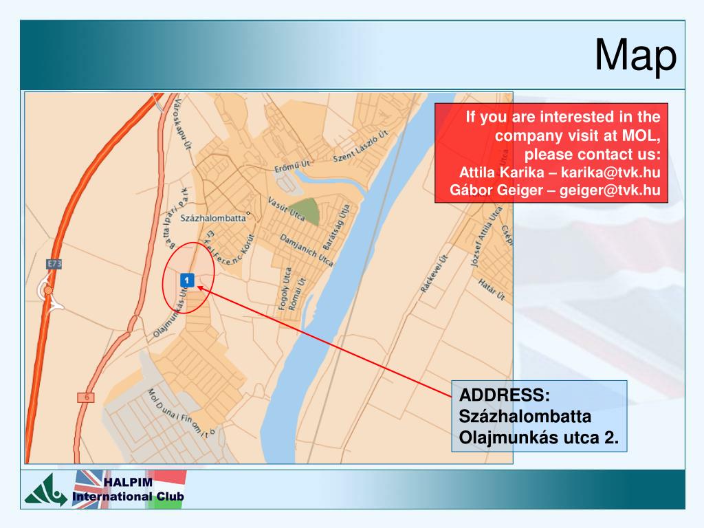 Map If you are interested in the company visit at MOL, please contact us: Attila Karika – karika@tvk.hu Gábor Geiger – geiger@tvk.hu ADDRESS: Százhalombatta Olajmunkás utca 2.