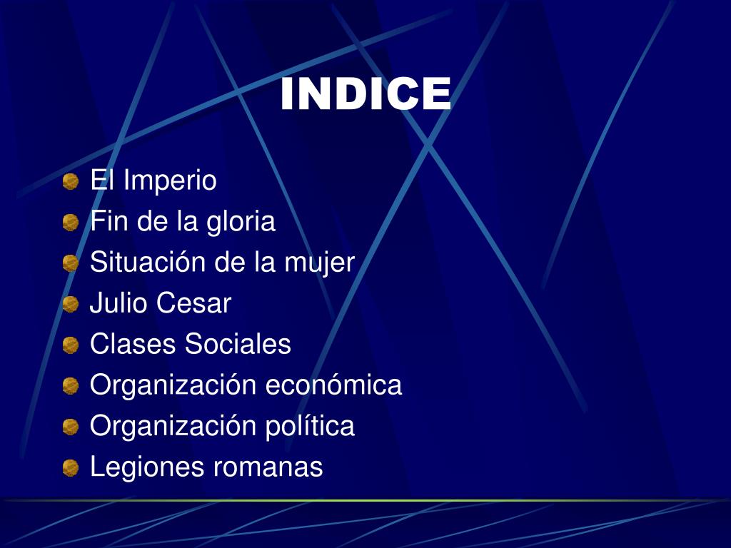 INDICE • El Imperio • Fin de la gloria • Situación de la mujer • Julio Cesar • Clases Sociales • Organización económica • Organización política • Legiones romanas