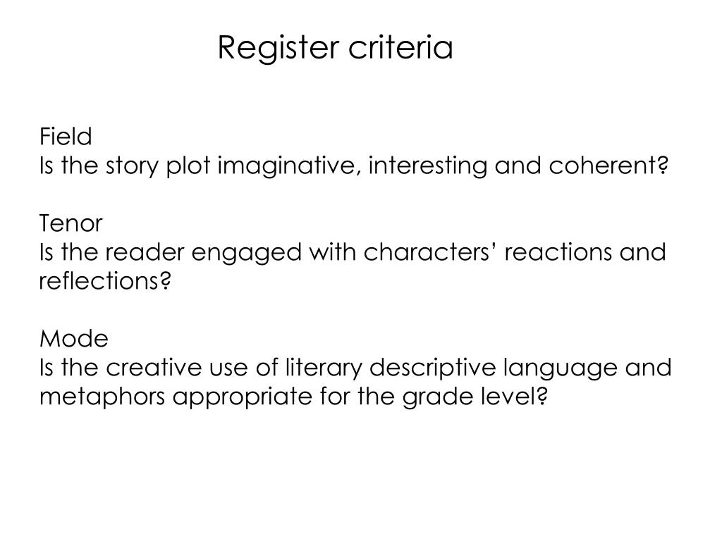 Register criteria Field Is the story plot imaginative, interesting and coherent? Tenor Is the reader engaged with characters’ reactions and reflections? Mode Is the creative use of literary descriptive language and metaphors appropriate for the grade level?