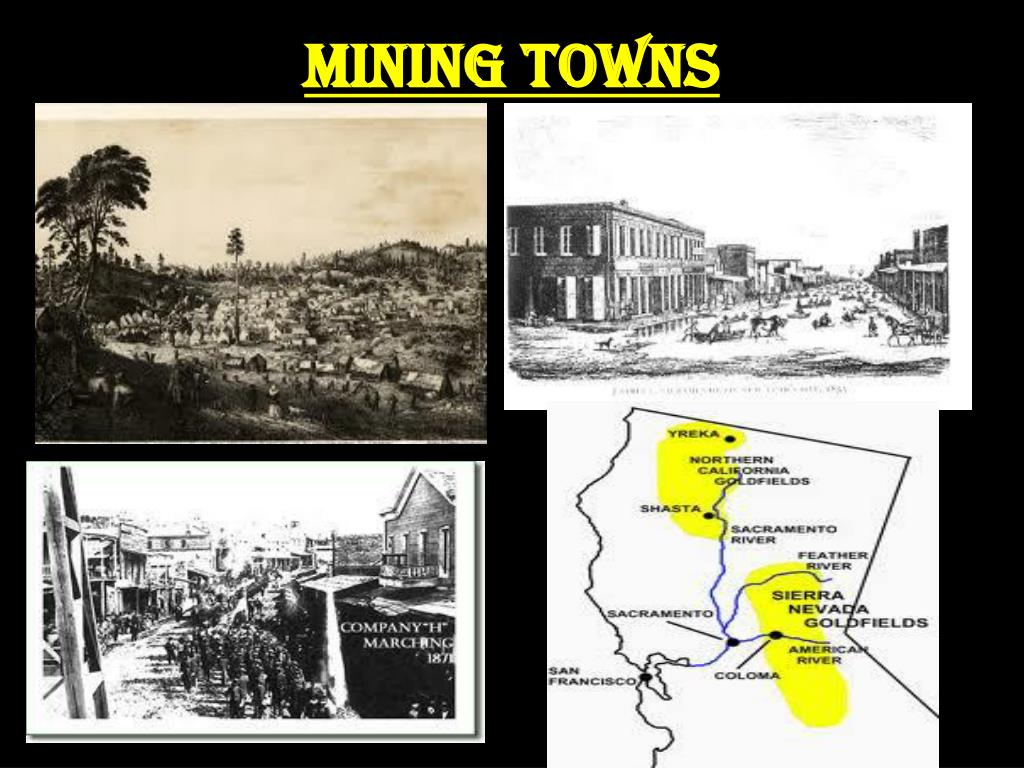 Life in the Mining Towns • Places were enough people settled into one area to look for gold. • Also called Skunk Gulch, Hangtown, Git-Up-and-Git, and Dry Diggings. • These towns had little law and order. Theft and miscommunication was a common problem with a tiny presence of authorities. • Settlers that didn’t find gold often made money by selling goods or cooking meals for the miners. Miners would pay large amounts of money for food. A loaf of bread in the East would cost about 5-10 cents; in the West it would cost about 50-75 cents.