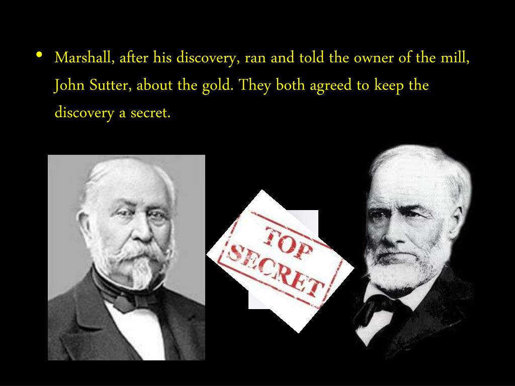 Marshall, after his discovery, ran and told the owner of the mill, John Sutter, about the gold. They both agreed to keep the discovery a secret.