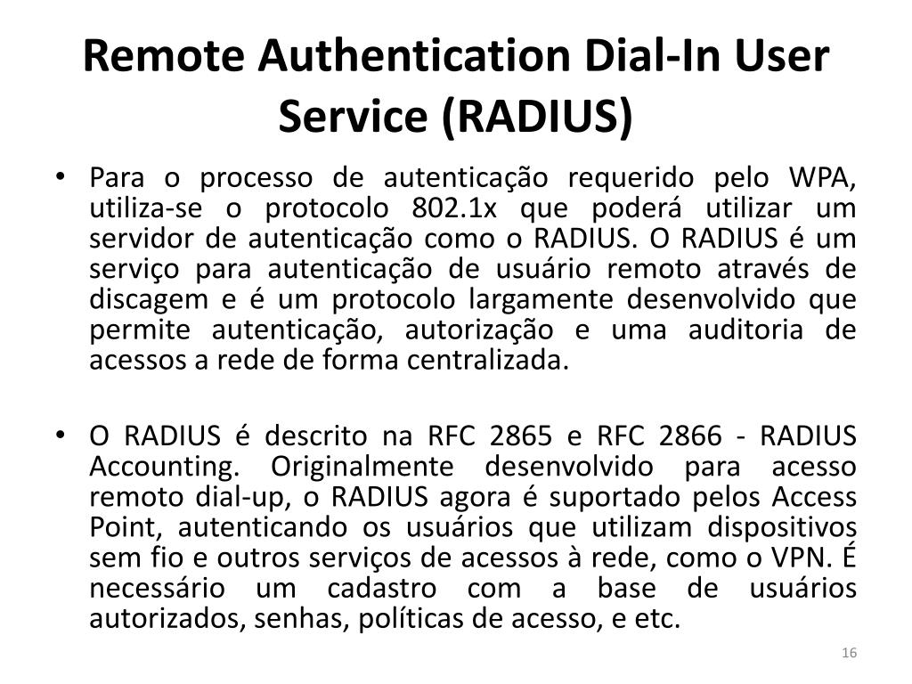 Remote Authentication Dial-In UserService (RADIUS) • Para o processo de autenticação requerido pelo WPA, utiliza-se o protocolo 802.1x que poderá utilizar um servidor de autenticação como o RADIUS. O RADIUS é um serviço para autenticação de usuário remoto através de discagem e é um protocolo largamente desenvolvido que permite autenticação, autorização e uma auditoria de acessos a rede de forma centralizada. • O RADIUS é descrito na RFC 2865 e RFC 2866 - RADIUS Accounting. Originalmente desenvolvido para acesso remoto dial-up, o RADIUS agora é suportado pelos Access Point, autenticando os usuários que utilizam dispositivos sem fio e outros serviços de acessos à rede, como o VPN. É necessário um cadastro com a base de usuários autorizados, senhas, políticas de acesso, e etc.
