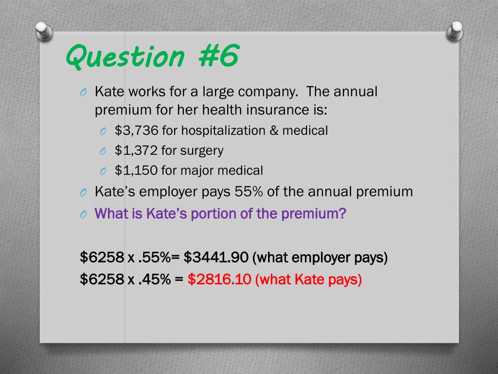 Question #6 • Kate works for a large company. The annual premium for her health insurance is: • $3,736 for hospitalization & medical • $1,372 for surgery • $1,150 for major medical • Kate’s employer pays 55% of the annual premium • What is Kate’s portion of the premium? $6258 x .55%= $3441.90 (what employer pays) $6258 x .45% = $2816.10 (what Kate pays)