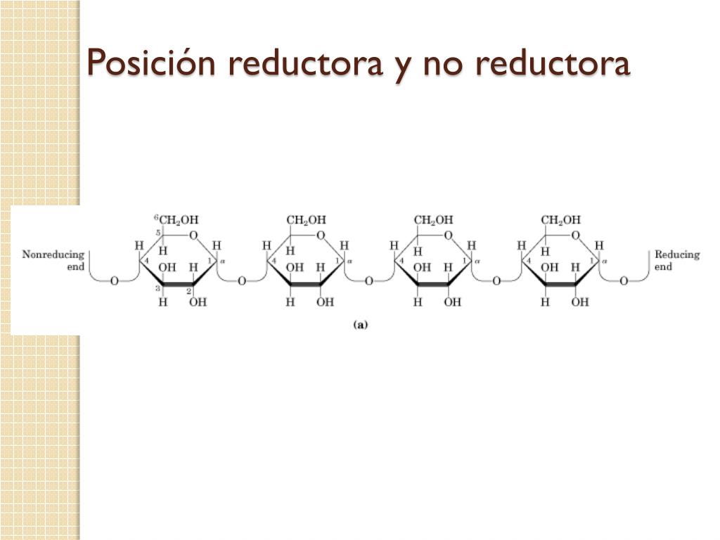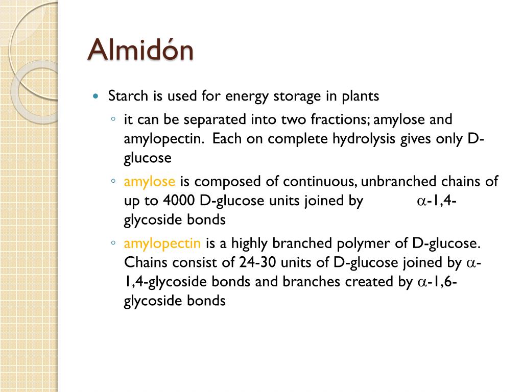 Almidón • Starchisusedforenergystorage in plants • it can beseparatedintotwofractions; amylose and amylopectin. Eachon complete hydrolysisgivesonly D-glucose • amyloseiscomposed of continuous, unbranchedchains of up to 4000 D-glucoseunitsjoinedbya-1,4-glycoside bonds • amylopectinis a highlybranchedpolymer of D-glucose. Chainsconsist of 24-30 units of D-glucosejoinedbya-1,4-glycoside bonds and branchescreatedbya-1,6-glycoside bonds