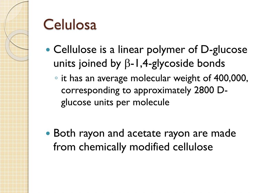 Celulosa • Cellulose is a linear polymer of D-glucose units joined by b-1,4-glycoside bonds • it has an average molecular weight of 400,000, corresponding to approximately 2800 D-glucose units per molecule • Both rayon and acetate rayon are made from chemically modified cellulose