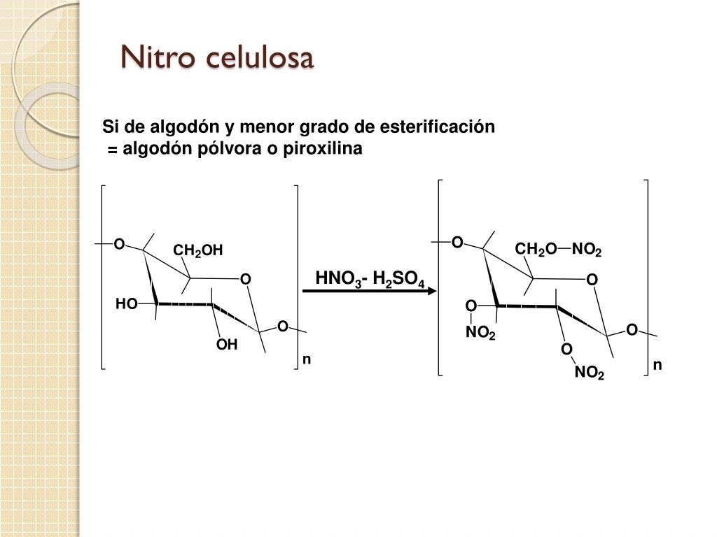 Nitro celulosa Si de algodón y menor grado de esterificación = algodón pólvora o piroxilina HNO3- H2SO4