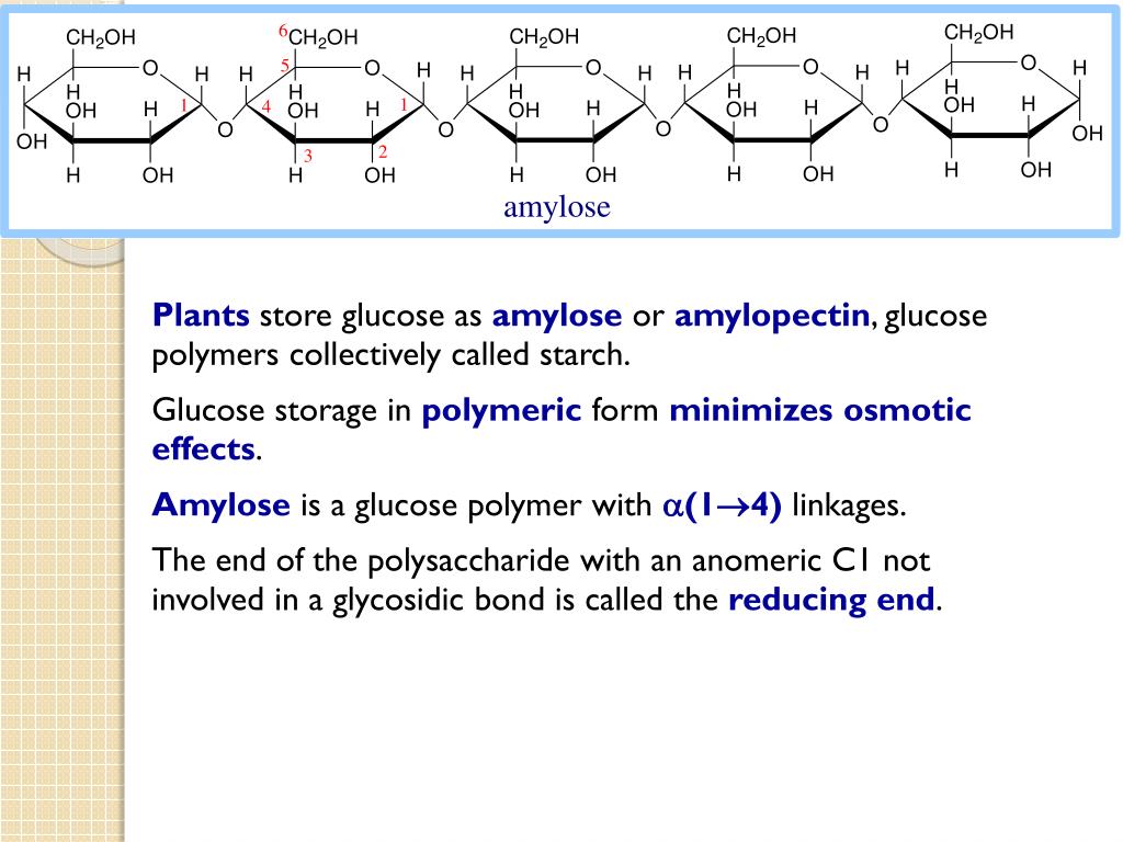 Plantsstore glucose as amylose or amylopectin, glucose polymers collectively called starch. Glucose storage in polymeric form minimizes osmotic effects. Amylose is a glucose polymer with a(14) linkages. The end of the polysaccharide with an anomeric C1 not involved in a glycosidic bond is called the reducing end.