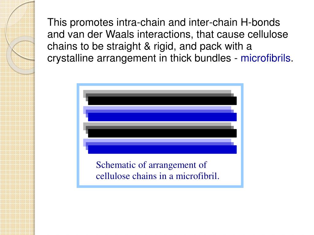 This promotes intra-chain and inter-chain H-bonds and van der Waals interactions, that cause cellulose chains to be straight & rigid, and pack with a crystalline arrangement in thick bundles - microfibrils.