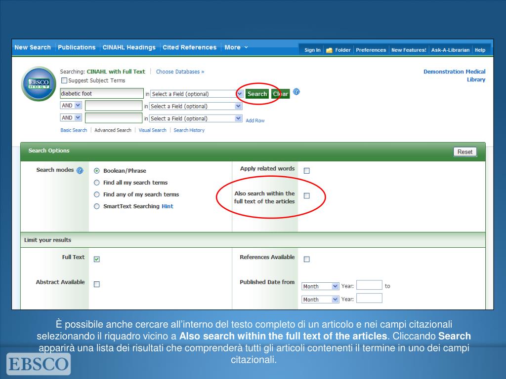 Inizieremo con unaricerca per parolachiavenellaschermatadellaricercaavanzata. Inserendodiabetic footnel campo Find. CINAHL with Full text offre diverse modalità di ricercaoltre a varilimiti e funzionalità per estenderla. SelezionareFull Text per restringereirisultatiai soli checomprendonoiltestocompleto.