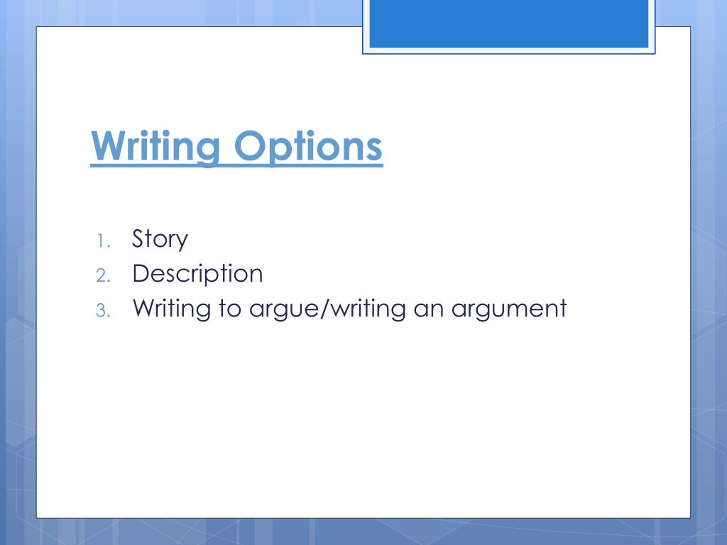 Writing Options • Story • Description • Writing to argue/writing an argument