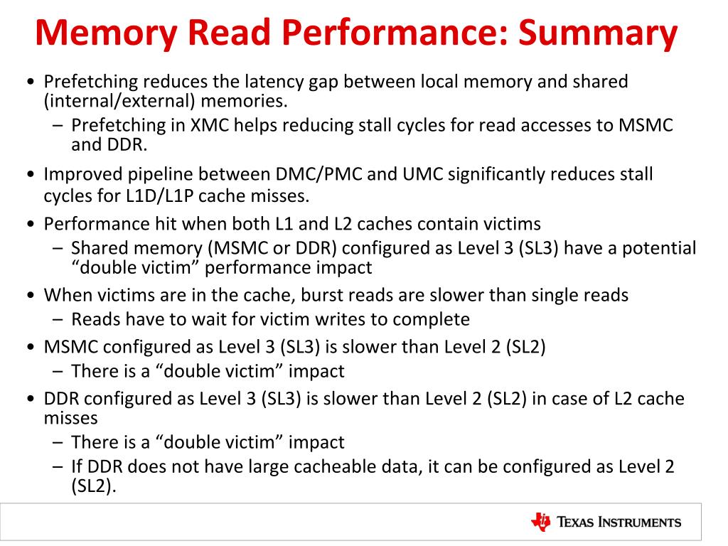 Memory Read Performance: Summary Prefetching reduces the latency gap between local memory and shared (internal/external) memories. Prefetching in XMC helps reducing stall cycles for read accesses to MSMC and DDR. Improved pipeline between DMC/PMC and UMC significantly reduces stall cycles for L1D/L1P cache misses. Performance hit when both L1 and L2 caches contain victims Shared memory (MSMC or DDR) configured as Level 3 (SL3) have a potential “double victim” performance impact When victims are in the cache, burst reads are slower than single reads Reads have to wait for victim writes to complete MSMC configured as Level 3 (SL3) is slower than Level 2 (SL2) There is a “double victim” impact DDR configured as Level 3 (SL3) is slower than Level 2 (SL2) in case of L2 cache misses There is a “double victim” impact If DDR does not have large cacheable data, it can be configured as Level 2 (SL2).