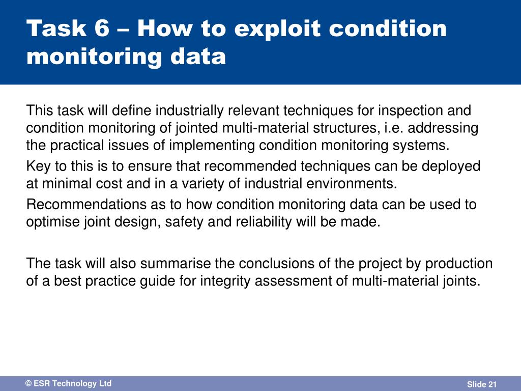 Task 6 – How to exploit condition monitoring data This task will define industrially relevant techniques for inspection and condition monitoring of jointed multi-material structures, i.e. addressing the practical issues of implementing condition monitoring systems. Key to this is to ensure that recommended techniques can be deployed at minimal cost and in a variety of industrial environments. Recommendations as to how condition monitoring data can be used to optimise joint design, safety and reliability will be made. The task will also summarise the conclusions of the project by production of a best practice guide for integrity assessment of multi-material joints.