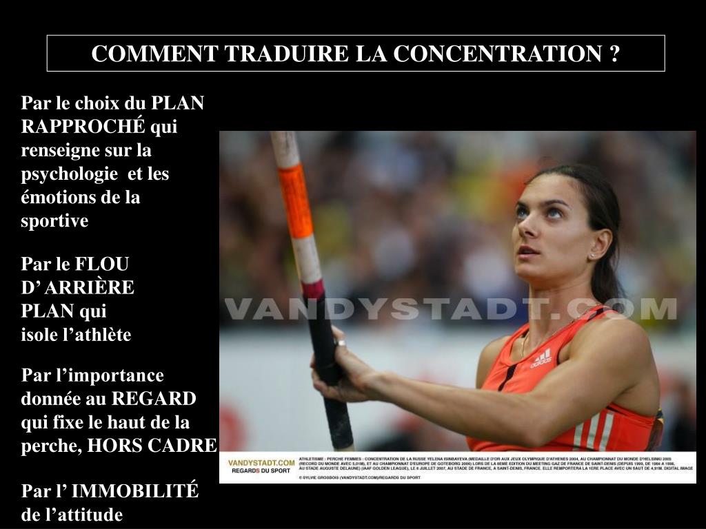COMMENT TRADUIRE LA CONCENTRATION ? Par le choix du PLAN RAPPROCHÉ qui renseigne sur la psychologie et les émotions de la sportive Par le FLOU D’ ARRIÈRE PLAN qui isole l’athlète Par l’importance donnée au REGARD qui fixe le haut de la perche, HORS CADRE Par l’ IMMOBILITÉ de l’attitude