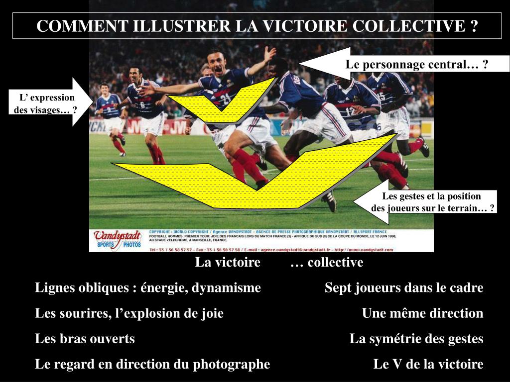 COMMENT ILLUSTRER LA VICTOIRE COLLECTIVE ? Le personnage central… ? L’ expression des visages… ? v v Les gestes et la position des joueurs sur le terrain… ? La victoire Lignes obliques : énergie, dynamisme Les sourires, l’explosion de joie Les bras ouverts Le regard en direction du photographe … collective Sept joueurs dans le cadre Une même direction La symétrie des gestes Le V de la victoire