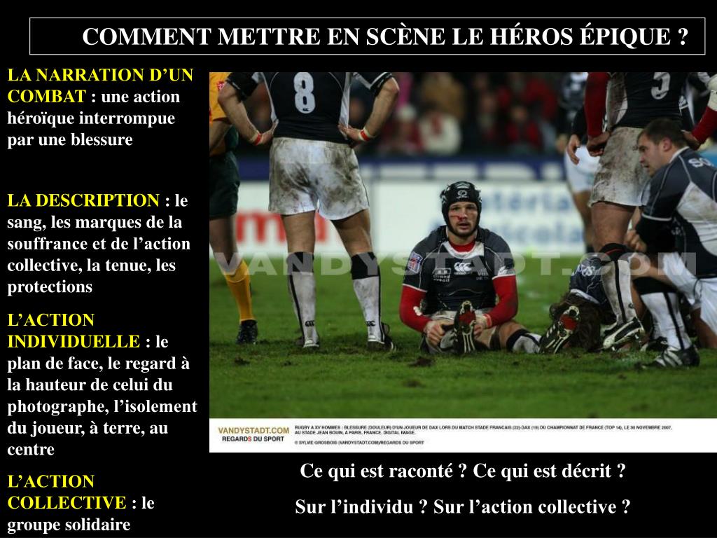 COMMENT METTRE EN SCÈNE LE HÉROS ÉPIQUE ? LA NARRATION D’UN COMBAT : une action héroïque interrompue par une blessure LA DESCRIPTION : le sang, les marques de la souffrance et de l’action collective, la tenue, les protections L’ACTION INDIVIDUELLE : le plan de face, le regard à la hauteur de celui du photographe, l’isolement du joueur, à terre, au centre Ce qui est raconté ? Ce qui est décrit ? Sur l’individu ? Sur l’action collective ? L’ACTION COLLECTIVE : le groupe solidaire
